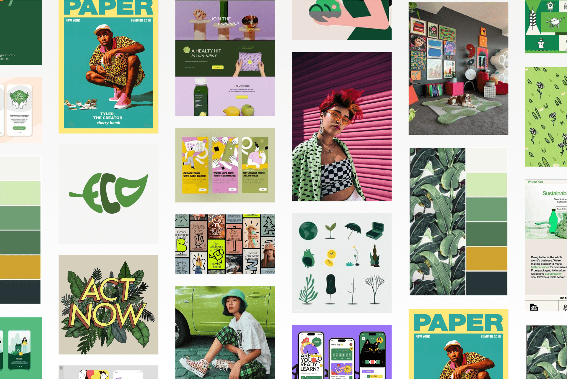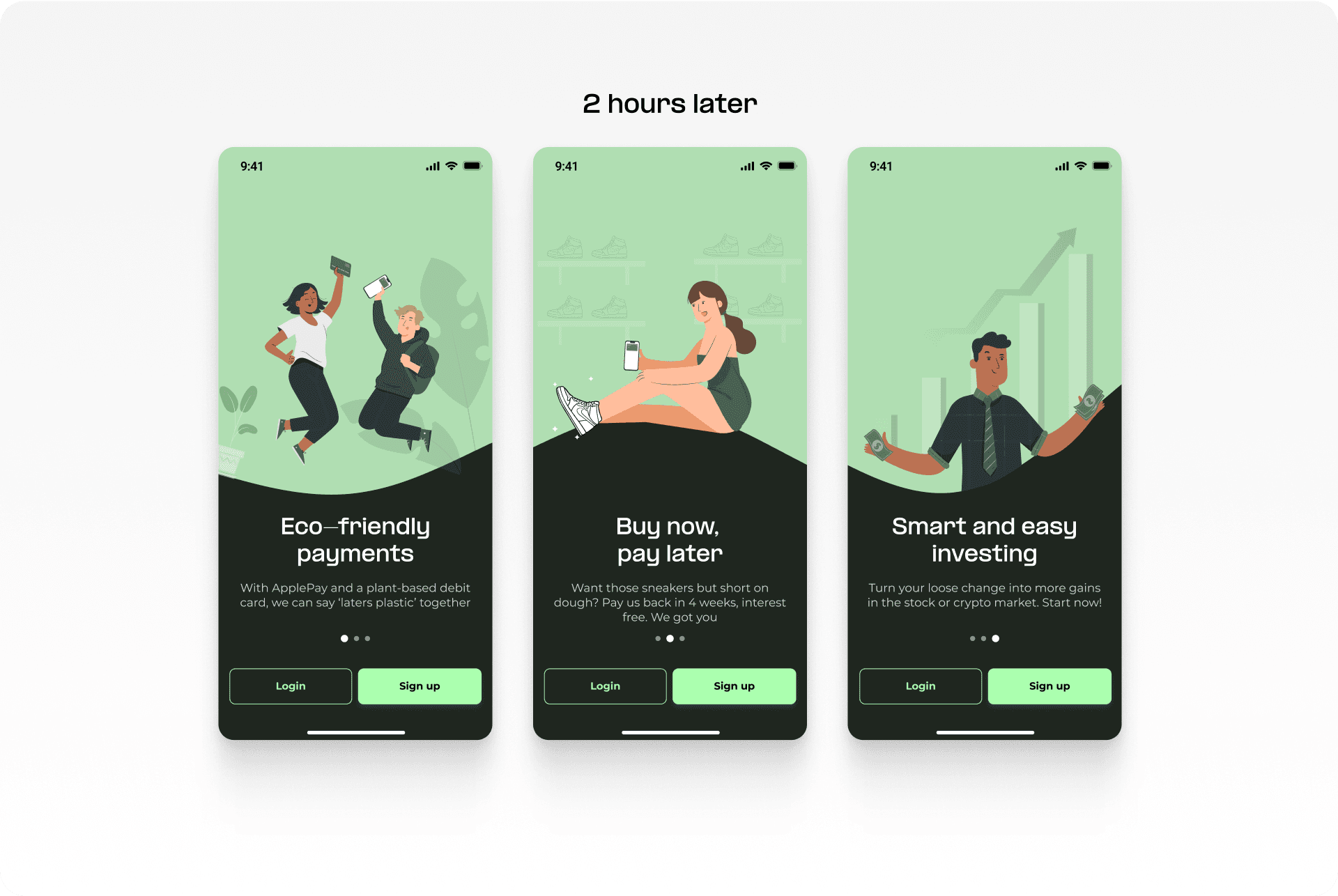 Researching global trends and observed peers to understand young adults' fintech preferences. Analysing popular fintech apps' onboarding experiences. I initially wanted to create an Instagram-story-like flow but with a short deadline I opted for something simple while still effective. A moodboard design based on key words from the brief helped refine the overall visual direction. Green was chosen for its natural and optimistic associations. Additionally designed a logo—a leaf vector resembling a "G"—fitting for the brand name. Diverse illustrations enhance inclusivity, and a modern dark theme which appeals to most young adults.